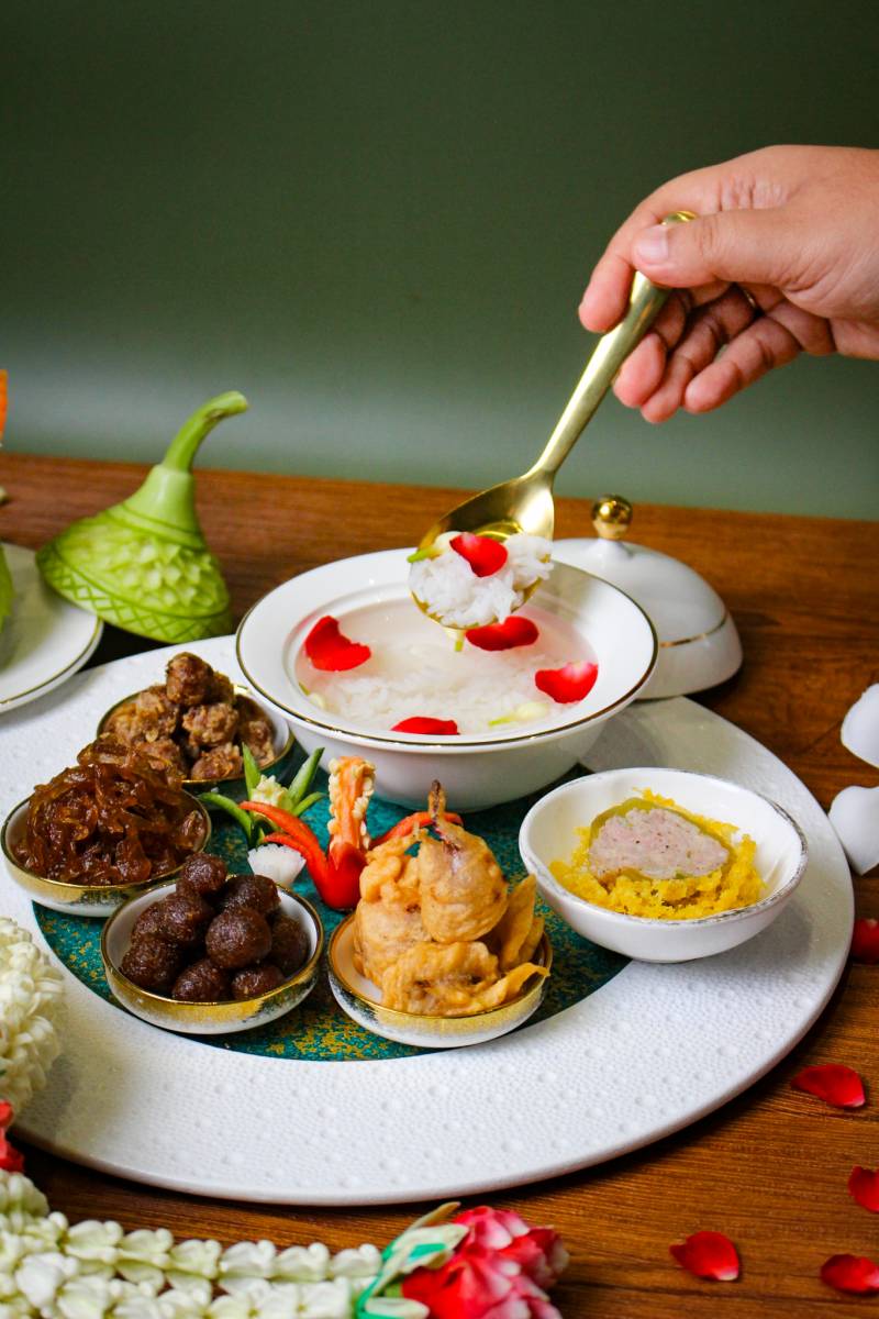 เปิดประสบการณ์ความสดชื่นด้วย ข้าวแช่สูตรดั้งเดิม ข้าวหอมมะลิคัดพิเศษ แช่ในน้ำอบควันเทียนหอมเย็น โรยด้วยกลีบกุหลาบและดอกมะลิ เสิร์ฟพร้อมเครื่องเคียงรสละเมียดละไมที่เตรียมด้วยความพิถีพิถัน อาทิ หอมแดงทอดกรอบ พริกหยวกสอดไส้ไก่ ลูกกะปิทอด ปลายี่สกผัดหวานรสกลมกล่อม ไชโป๊วผัดหวาน แตงโมปลาแห้ง
